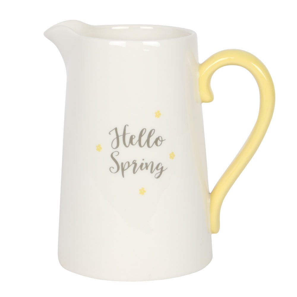 This ceramic flower jug will welcome in the season with 'Hello Spring' text and a contrasting yellow handle. Perfect for holding flowers as a vase or gifting for Mother's Day, teacher gifts, birthdays and more.Product Dimensions: H17.5cm x W17.5cm x D11.7cm Packaged Dimensions: H18.5cm x W18.5cm x D12.5cm