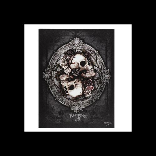 This small canvas plaque features the detailed 'Dioscuri' artwork by the popular Alchemy Gothic of London. A pair of fanged skulls are wrapped in roses and thorns in this greyscale piece. 19x25cm. The digital watermark will not appear in the print design. Product Dimensions: H25cm x W19cm x D1.5cm Packaged Dimensions: H25cm x W19cm x D1.5cm
