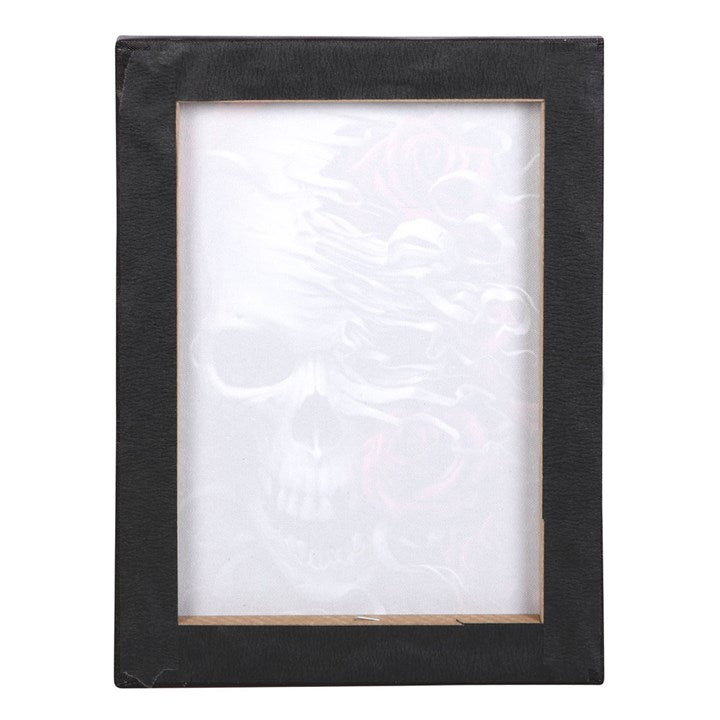 This dark and alluring canvas plaque features licensed artwork from Spiral Direct. 'Skulls n Roses' depicts group of red roses breaking out of a menacing a human skull and will elevate your gothic decor. 19x25cm.