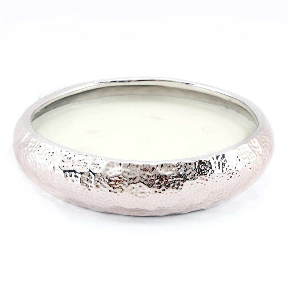 A beautiful scented 7-wick candle in a large silver ceramic bowl with a hammered effect. Made from paraffin and palm wax. 'Eye of the Tiger' fragrance. Do not leave a burning candle unattended.