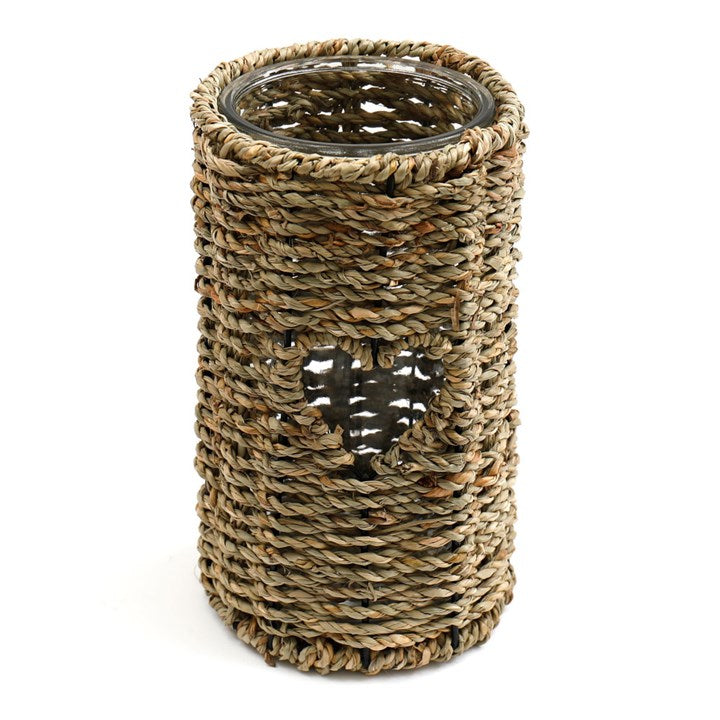 A 21cm twisted seagrass candle holder with heart cut out and glass insert. Makes a simple accent for the home.