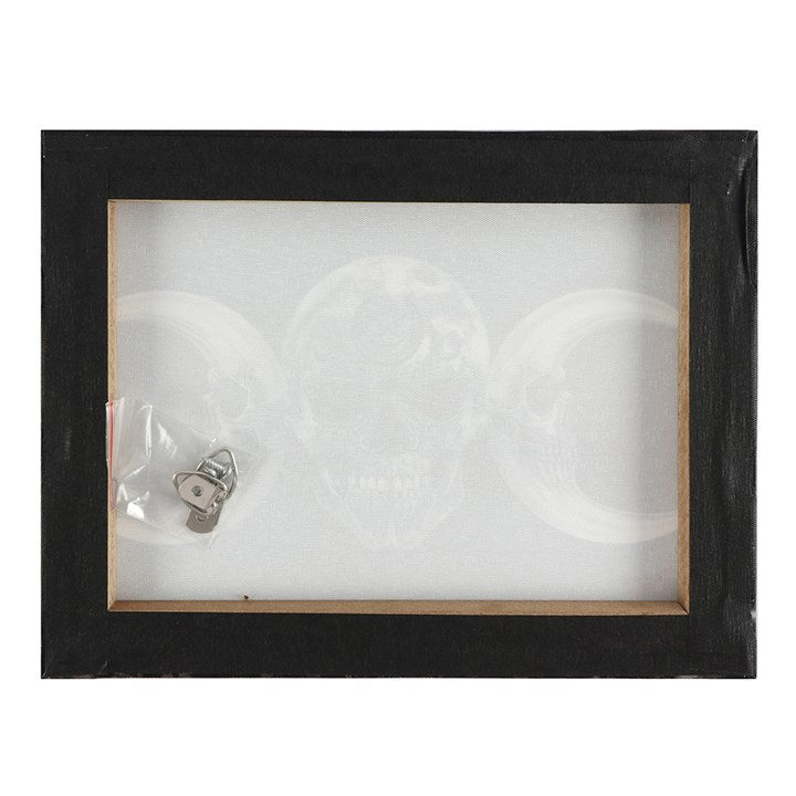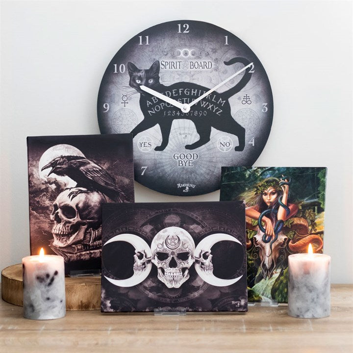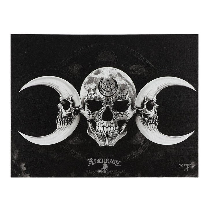This small canvas plaque features the detailed 'Dark Goddess' artwork by the popular Alchemy Gothic of London. This amazing greyscale piece features a triple moon design made up of human skulls. 19x25cm. The digital watermark will not appear in the print design. Product Dimensions: H25cm x W19cm x D1.5cm Packaged Dimensions: H25cm x W19cm x D1.5cm