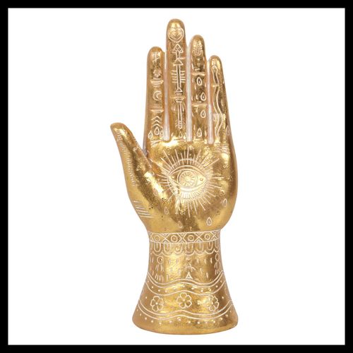 Measuring 26cm this decorative golden Hamsa hand ornament is a unique and eyecatching piece which would compliment an area designed for relaxation and mediation.Packaged Dimensions: H28cm x W12.5cm x D9cm