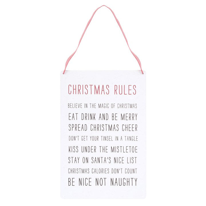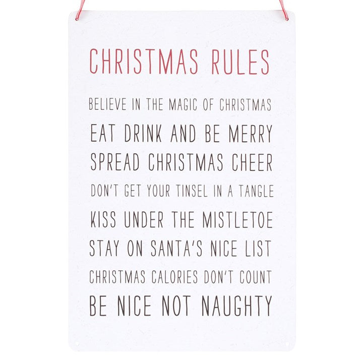 Celebrate the Christmas season with this metal sign featuring Christmas Rules text. With a list of dos and don'ts, this festive decoration is the perfect way to remind everyone to be merry, spread cheer, and embrace the magic of the season.