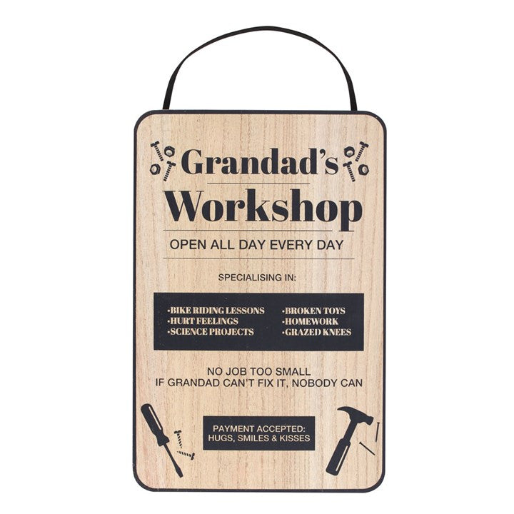 A quirky MDF sign to decorate Grandad's favourite place - his workshop! Features text that reads, 'Grandad's Workshop. Open all day every day. Specialising in: Bike riding lessons, Hurt feelings, Science projects, Broken toys, Homework, Grazed knees. No job too small. If Grandad can't fix it, nobody can. Payment accepted: hugs, smiles & kisses' with a string for hanging.