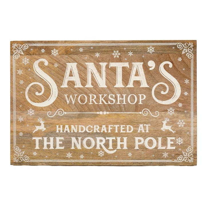 Bring a touch of the North Pole into the home with this Santa's Workshop Plaque. Featuring a rustic, whitewashed finish and adorned with snowflake and reindeer designs, this plaque makes the perfection addition to Christmas decor. Ideal for hanging on walls or displaying on shelves. 95% Mango Wood, 5% Iron.