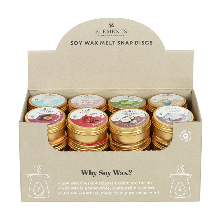 This display of 32 Mixed wax melt tins from Elements Home Fragrance includes 8 classic fragrances in easy-to-use disc form. Each 25g disc is divided into 4 sections for up to 45 hours of long-lasting fragrance per tin. Handmade in the UK from 100% vegan soy wax and high-quality fragrance oil blends, our soy wax melts are non-toxic and completely biodegradable. Our Mixed scents include; Cherry Blossom, Lime Basil & Mandarin, Fresh Cotton Towels, Birthday Cake, Coconut Breeze, Black Plum & Rhubarb, Baby Powder and Wild Rose.