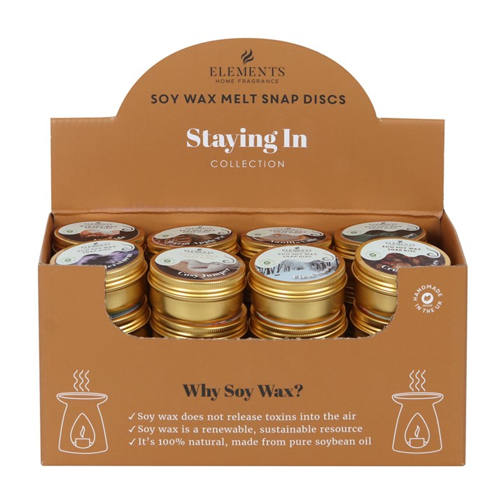 This display of 32 'Staying In' wax melt tins from Elements Home Fragrance includes 8 cosy fragrances in easy-to-use disc form. Each 25g disc is divided into 4 sections for up to 45 hours of long-lasting fragrance per tin. Handmade in the UK from 100% vegan soy wax and high-quality fragrance oil blends, our soy wax melts are non-toxic and completely biodegradable. Our 'Staying In' scents include; First Snow, Fireside, Cosy Jumper, Crunchy Leaves, Thunderstorm, Rainy Day, Warm Apple Pie and Vanilla Latte.