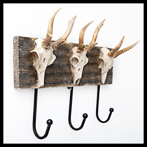 This wall mounted coat hanger will make quite a conversation starter. Features 3 faux deer skulls with horns and 3 black metal hooks.