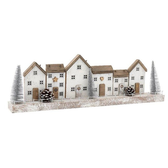Set the scene this winter with a charming Christmas village decoration. A row of wooden houses are accented by snowy bottle brush trees, pinecones and a miniature fence that create a charming display for the chilly season.