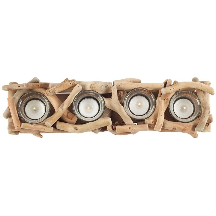 Place four of your favorite tealights in the center of this driftwood and glass candle holder to fill your home or office with the feeling of the seaside. Size and shape of driftwood holder may vary due to the natural differences in the material. Candles not included.Product Dimensions: H6cm x W40cm x D10cm Packaged Dimensions: H6cm x W40cm x D10cm