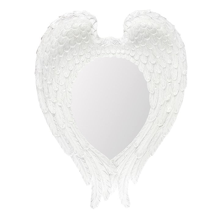 A stunning and impactful angel wing wall mirror. The mirror is nestled between two large angel wings, finished in white and accented with glitter to add sparkle to the elegant and eye-catching design. Product Dimensions: H55cm x W41cm x D7cm Packaged Dimensions: H47.5cm x W62cm x D12.5cm