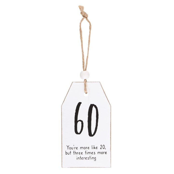 The perfect token gift for family and friends, this white sentiment wooden tag-shaped decoration features the words '60 - You're more like 20, but three times more interesting'. Approximately 8cm in height with twine hanger and finished with a wooden bead.