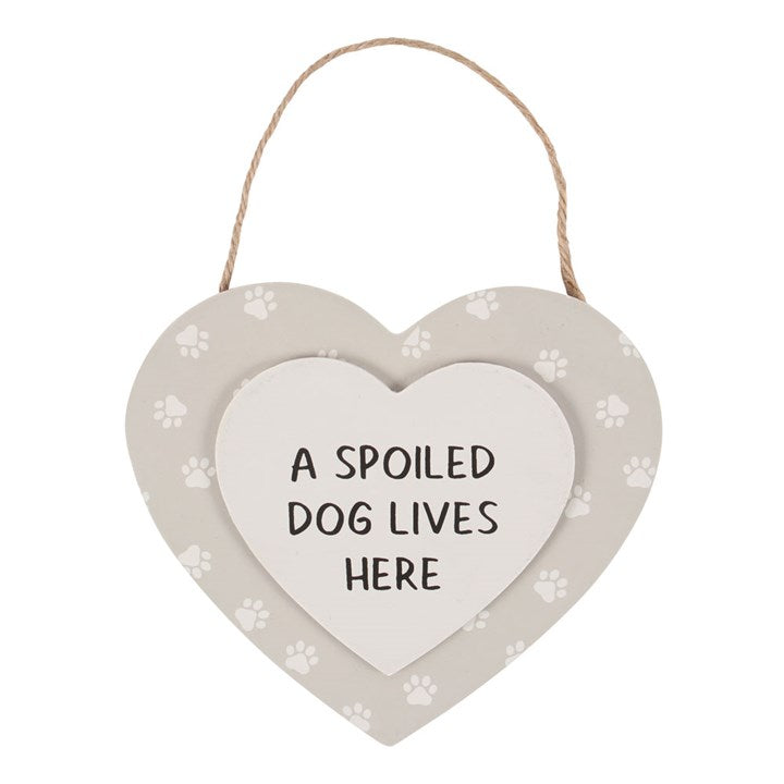 Heart-shaped hanging sign with a paw print design featuring the words 'A Spoiled Dog Lives Here'. Product Dimensions: H12.5cm x W14cm x D0.5cm Packaged Dimensions: H14.5cm x W14.5cm x D0.5cm