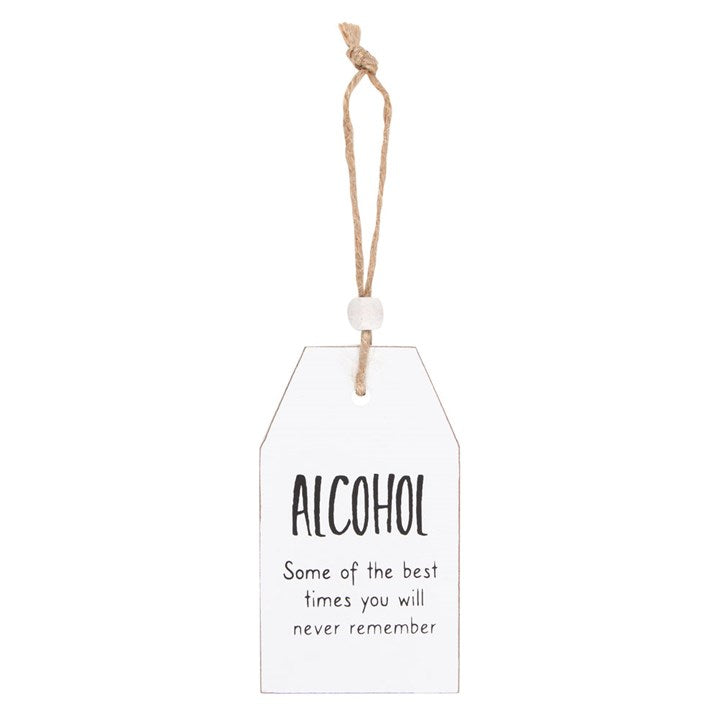 The perfect token gift for family and friends, this white sentiment wooden tag-shaped decoration features the words 'Alcohol. Some of the best times you will never remember'. Approximately 8cm in height with twine hanger and finished with a wooden bead.