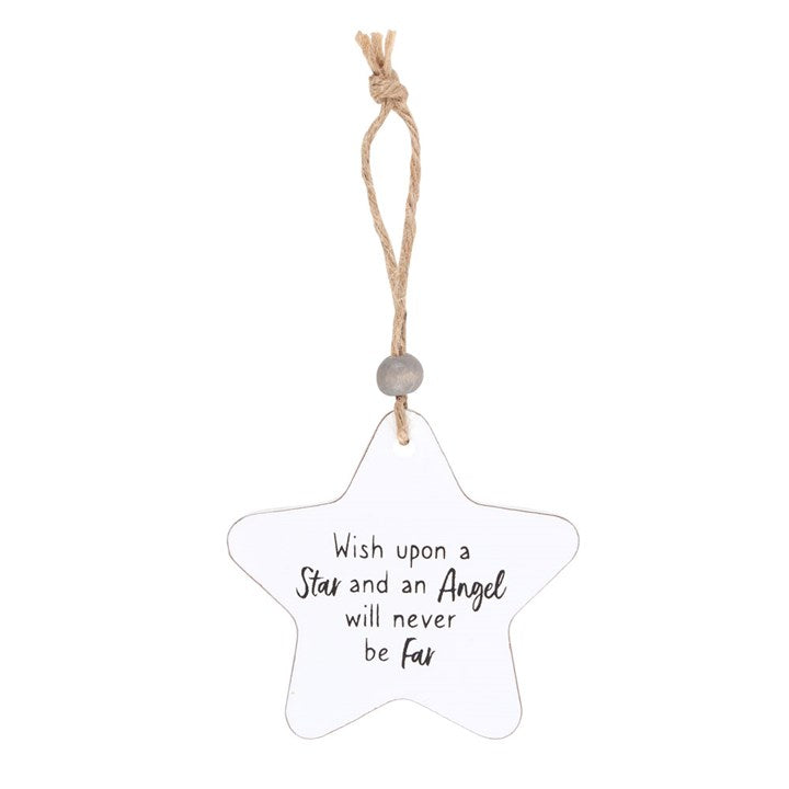 A small star sign perfect for remembering those special angels that have been lost. Features text that reads, 'Wish upon a star and an angel will never be far' and finished with a wooden bead. Designed by Something Different Wholesale and part of the Hanging Sentiment Sign range.