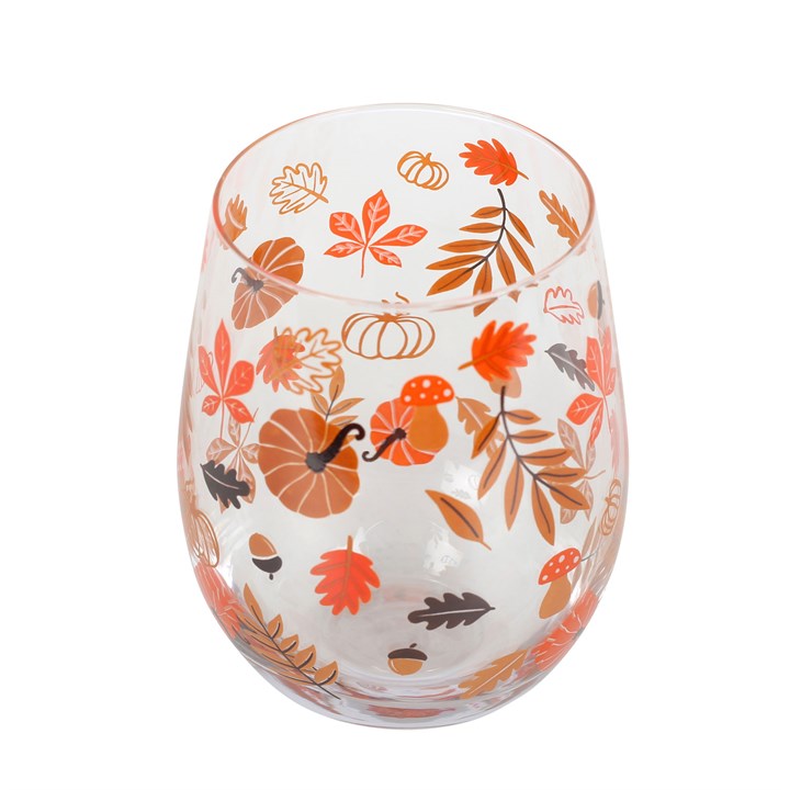 Put yourself in the seasonal spirit of autumn with this stemless glass, printed with a leaf and pumpkin design in autumnal shades of orange and red. Perfect for creating themed cocktails and table settings that embrace everything autumn. Not suitable for microwave use. 550ml.