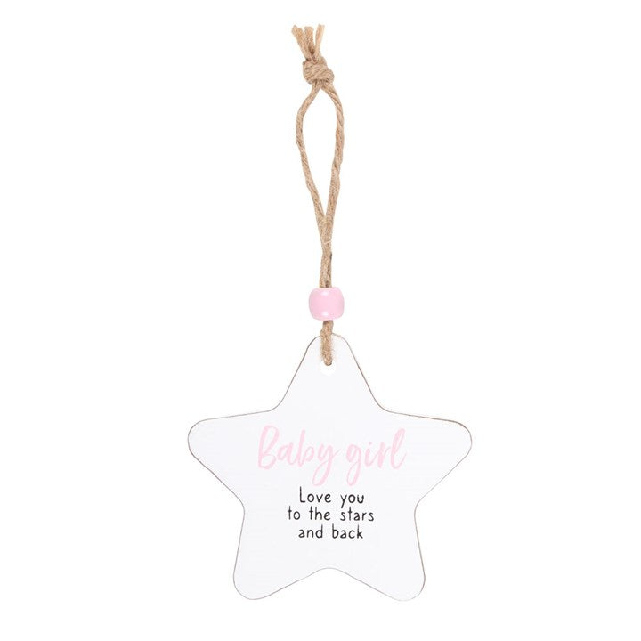 The perfect token gift for family and friends, this white sentiment wooden star decoration features the words 'Baby Girl. Love you to the stars and back'. Approximately 8cm x 8cm with twine hanger and finished with a wooden bead.