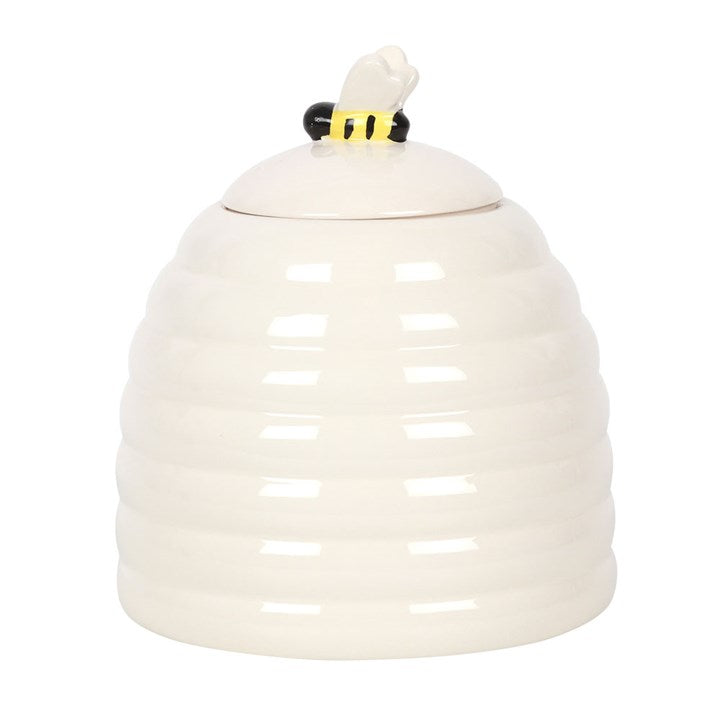This adorable yet practical ceramic 'Bee Happy' storage jar is shaped like a beehive and topped with a 3D bee detail. Perfect for storing treats like biscuits, sweets and cookies and sure to 'bee' a firm favourite with the whole family. Product Dimensions: H20cm x W17cm x D17cm Packaged Dimensions: H19.8cm x W20.4cm x D20.5cm