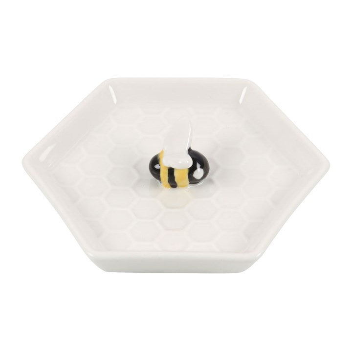 An adordable hexagon-shaped ceramic trinket dish with a 3D bee in the centre. Perfect for storing rings, earrings and other small and precious pieces. Product Dimensions: H2.5cm x W10.9cm x D10cm Packaged Dimensions: H2.5cm x W10.9cm x D10cm