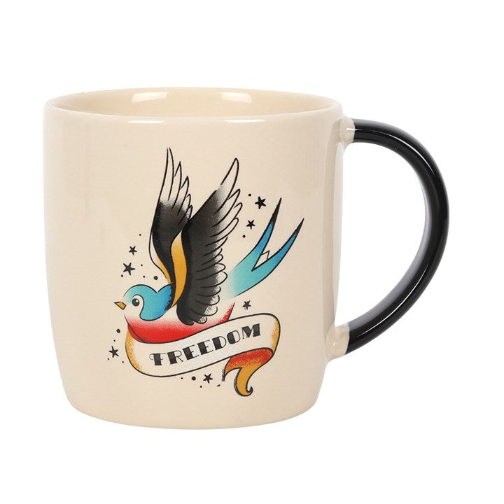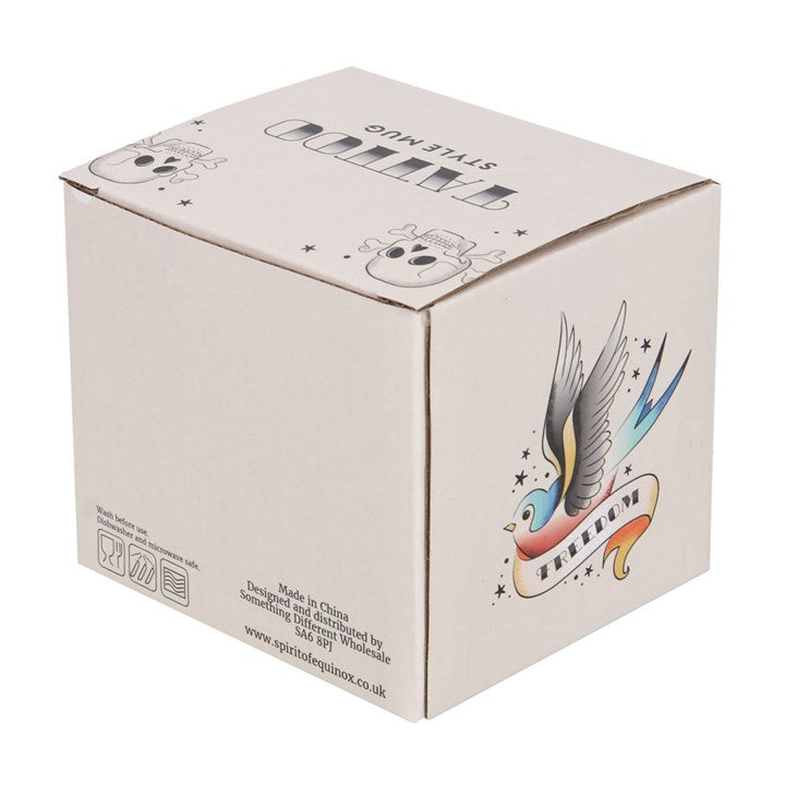 This 'Freedom' mug features a sparrow design in a vintage tattoo inspired style. Sparrow tattoos are said to represent freedom, love and commitment. Product Dimensions: H9.4cm x W8.6cm x D7.7cm Packaged Dimensions: H10.9cm x W9.6cm x D9.1cm
