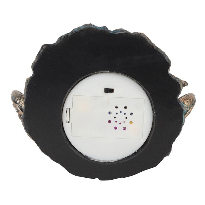 Baphomet, the occult deity commonly portrayed by a winged half-human, half-goat figure, sits atop a horned skull on this amazing backflow incense burner. While adopted as an icon of the Church of Satan, Baphomet originated as a symbol of contrast and balance by the Knights Templar. To use, simply add a backflow incense cone to Baphomet's lap and watch as the smoke emerges from the skull's lit eyes. Bottom on/off switch. 2 AA batteries required. Not included with the product. Product Dimensions: H22.5cm x W15cm x D12cm Packaged Dimensions: H26.5cm x W19cm x D15.5cm