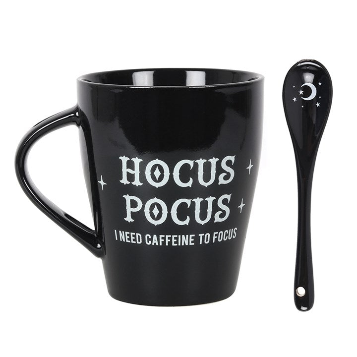 Black ceramic mug and spoon set with a 'Hocus Pocus I Need Caffeine to Focus' design. Dishwasher and microwave safe. Product Dimensions: H10cm x W12cm x D8.5cm Packaged Dimensions: H10.5cm x W11cm x D9cm