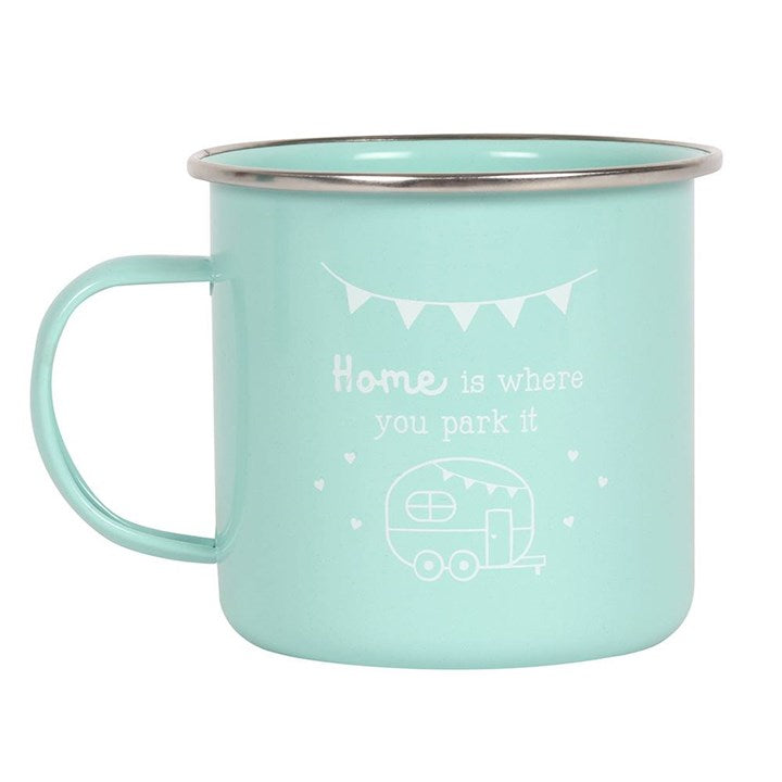 No caravan camping trip is complete without a classic enamel mug to sip out of. This fresh, mint colour is finished off with a white 'Home is where you park it' and caravan design. Do not use over open flame. Product Dimensions: H9cm x W12cm x D10cm Packaged Dimensions: H9cm x W12cm x D10cm
