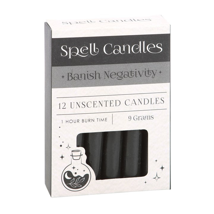 Refuse to allow negativity to affect you. Banish negativity and attract positivity with these black spell candles. Candle magic is one of the simplest forms of manifestation in which you decide on a goal, light the candle in a holder, visualise the end result and focus intent to manifest that result. Alternatively, write your intention on a black piece of paper and burn the paper in a fire safe bowl.The pack includes 12 unscented candles with an approx burn time of 1 hour. Do not burn for longer than 30 minutes at a time.