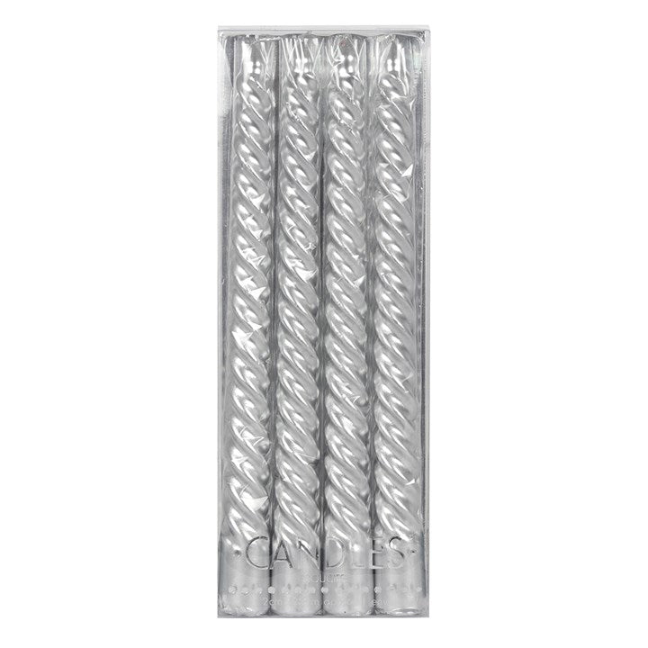The twisted style of these festive taper candles are beatifully showcased with a bright, silver finish. Perfect for decorating the dinner table for a wide range of occasions. Sold in packs of 4. Approximately 2cm at base. Product Dimensions: H25cm x W2.5cm x D2.5cm Packaged Dimensions: H26cm x W9.5cm x D2.5cm