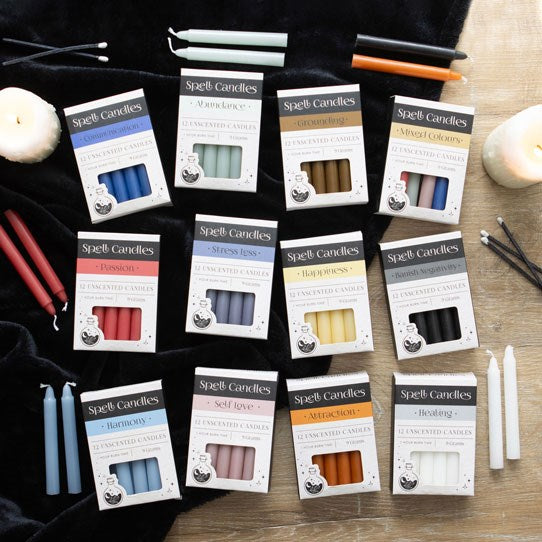 This set of 72 unscented spell candle packs is designed for easy top-ups and custom merchandising displays. Candle magic is one of the simplest forms of spell casting in which the caster decides on a goal, visualizes the end result and focuses intent or will to manifest that result. Typically the caster will write down their intent on a piece of paper the same colour as the candle, and burn the paper in a fire safe bowl. Each pack includes 12 spell candles. Colours include black for banishing negativity, white for healing, purple for stressing less, yellow for happiness, orange for attraction, brown for grounding, red for passion, green for abundance, pink for self love and blue for harmony. All of our spell candles are solid colour all the way through (not dipped). Each candle has an approx burn time of 1 hour. Made from paraffin wax. Colour may vary slightly between production batches.