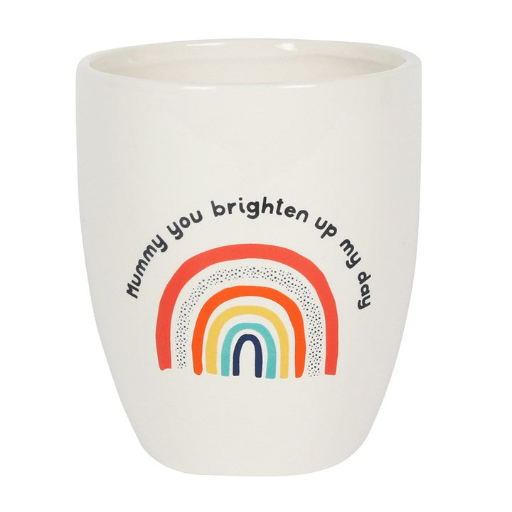 A beautiful contemporary gift for a little one to give for Mother's Day, or any occasion, as a reminder of how loved and appreciated she is. This white ceramic plant pot has a rainbow design as the quote 'Mummy you brighten up my day'. Product Dimensions: H13.2cm x W11.5cm x D11.5cm Packaged Dimensions: H14cm x W11cm x D11cm