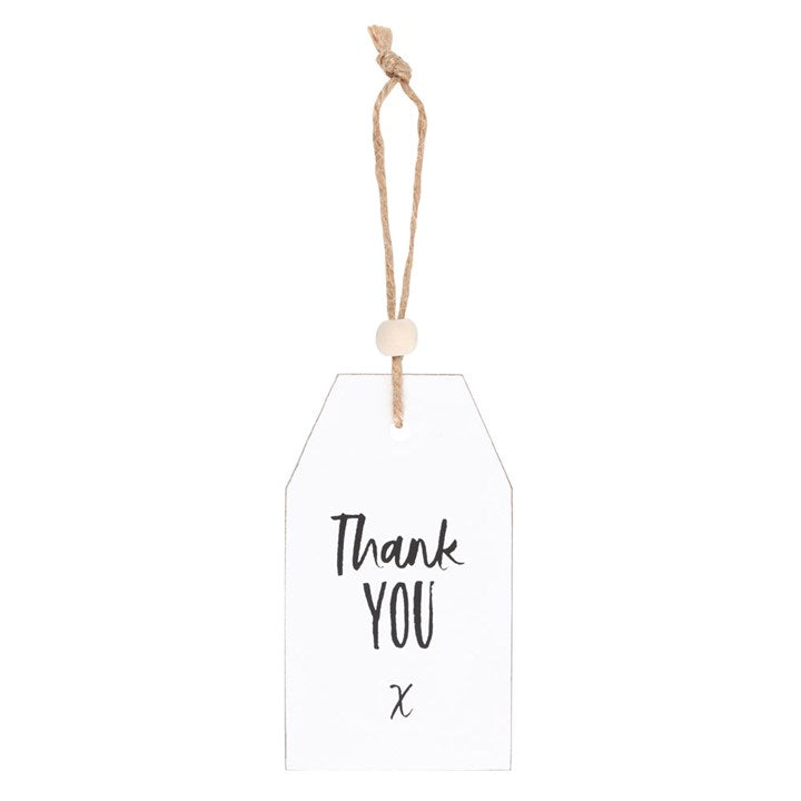 The perfect token gift for family and friends, this white sentiment wooden tag-shaped decoration features the words 'Thank you'. Approximately 8cm in height with twine hanger and finished with a wooden bead.