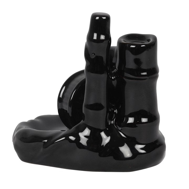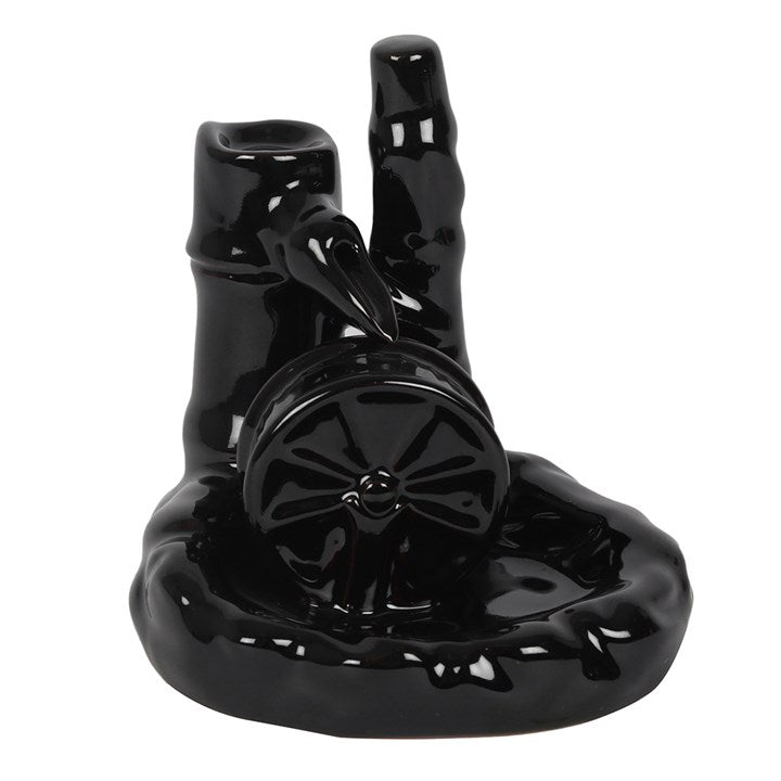 A black ceramic backflow incense burner with a water wheel and bamboo design. When a backflow cone is placed on top, smoke gently flows from a fountain spout and replicates water falling over an old fashioned water wheel. Product Dimensions: H12.5cm x W12cm x D10.5cm Packaged Dimensions: H15.5cm x W12cm x D10.5cm