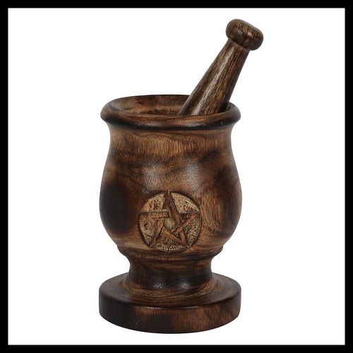 This carved wooden mortar and pestle is an essential tool for crushing and grinding herbs in a variety of sacred rituals. This style is accented by a carved pentagram design on the side.Packaged Dimensions: H13.5cm x W14cm x D11cm